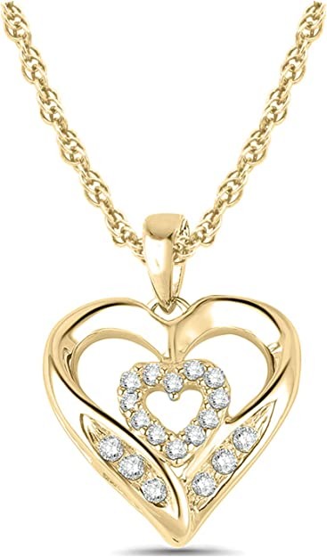 • 10K YELLOW GOLD WITH 1/10ct DIAMONDS AND 18” ROPE CHAIN: Pendant features a 10k yellow gold heart encasing a diamond heart and accented with round white diamonds (1/10 ct) on 18" 10k yellow gold rope chain with spring ring closure