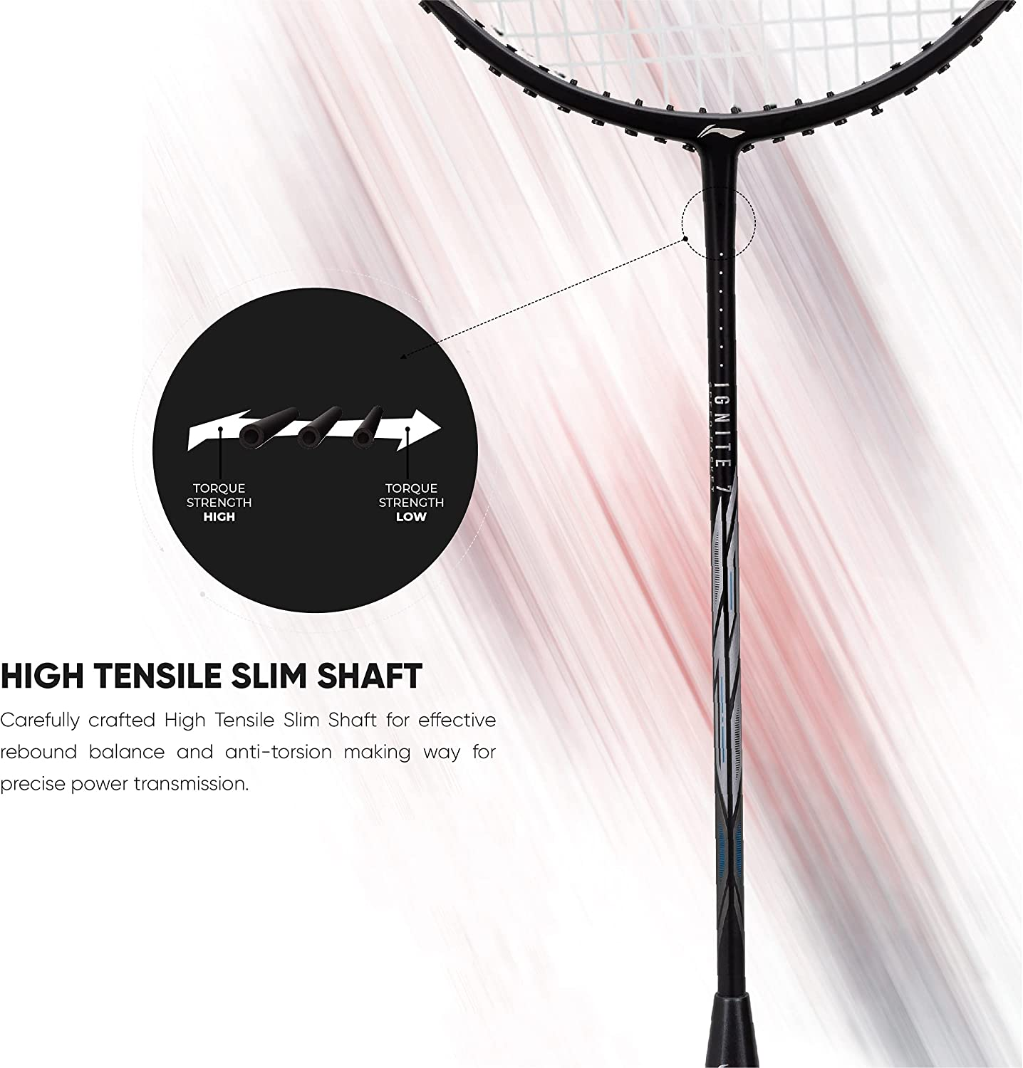 • The racket has been carefully crafted with a High Tensile Slim Shaft for effective rebound balance and anti-torsion making way for precise power transmission.